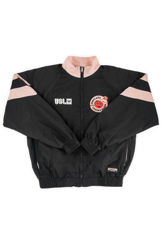 Inspired by the adrenaline of a debut season, this Official League x Cherry Bombs Stage Dive Shute mixes jet-black fabric with retro pink accents and the Cherry Bombs crest at the chest. It captures the rush of stepping onto the field for the first time, built with performance structure and a design that nods to vintage punk aesthetics.