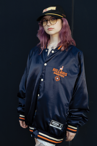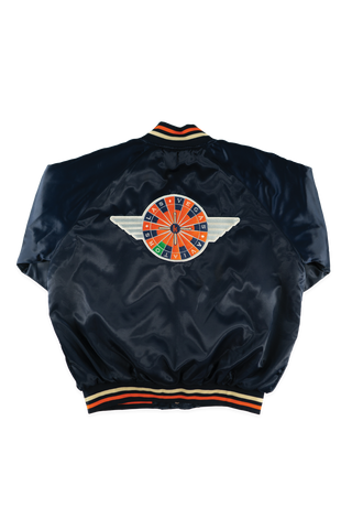 An Aviators Team Store exclusive, let it ride in this sleek Navy Satin. Rich in detail and built with a clean finish, the navy satin jacket shines with a bold Aviators x The Killers roulette wheel design stitched across the back. The orange and cream ribbing brings in a retro varsity feel, while dual chest logos keep the design sharp.