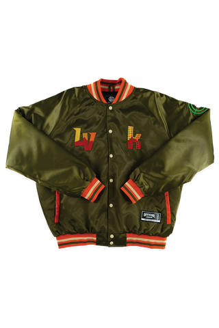 The green satin is the statement piece of this mission. A bold tribute to neon nights and game day energy, this premium satin jacket features orange ribbed varsity accents, embroidered logos from both collaborators, and a custom-stitched back logo that reimagines the famous Las Vegas sign as a baseball diamond with The Killers’ signature “K” logo at the center of it all. Finished with a smooth quilted lining, it channels the city’s glow and The Killers’ showmanship.
