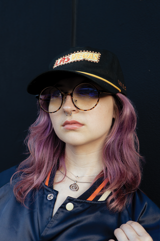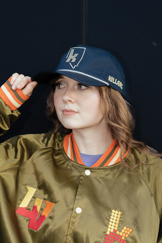 For headwear both poppy hats in the collection deliver their own take on Vegas born pride. The black Las Vegas Poppy version leans into boldness, with a marquee-style “Las Vegas” embroidered across the front in vivid red, yellow, and gold—paired with a metallic Killers logo on the side and a yellow cord detail that calls back to vintage show posters. The Nevada Poppy hat takes a more nostalgic route, centering The Killers’ iconic lightbulb “K” over a gold-stitched Nevada outline, flanked by logos from both the band and the team. Each hat is finished with a corded brim and an adjustable backstrap, made to fit Sin City just right.