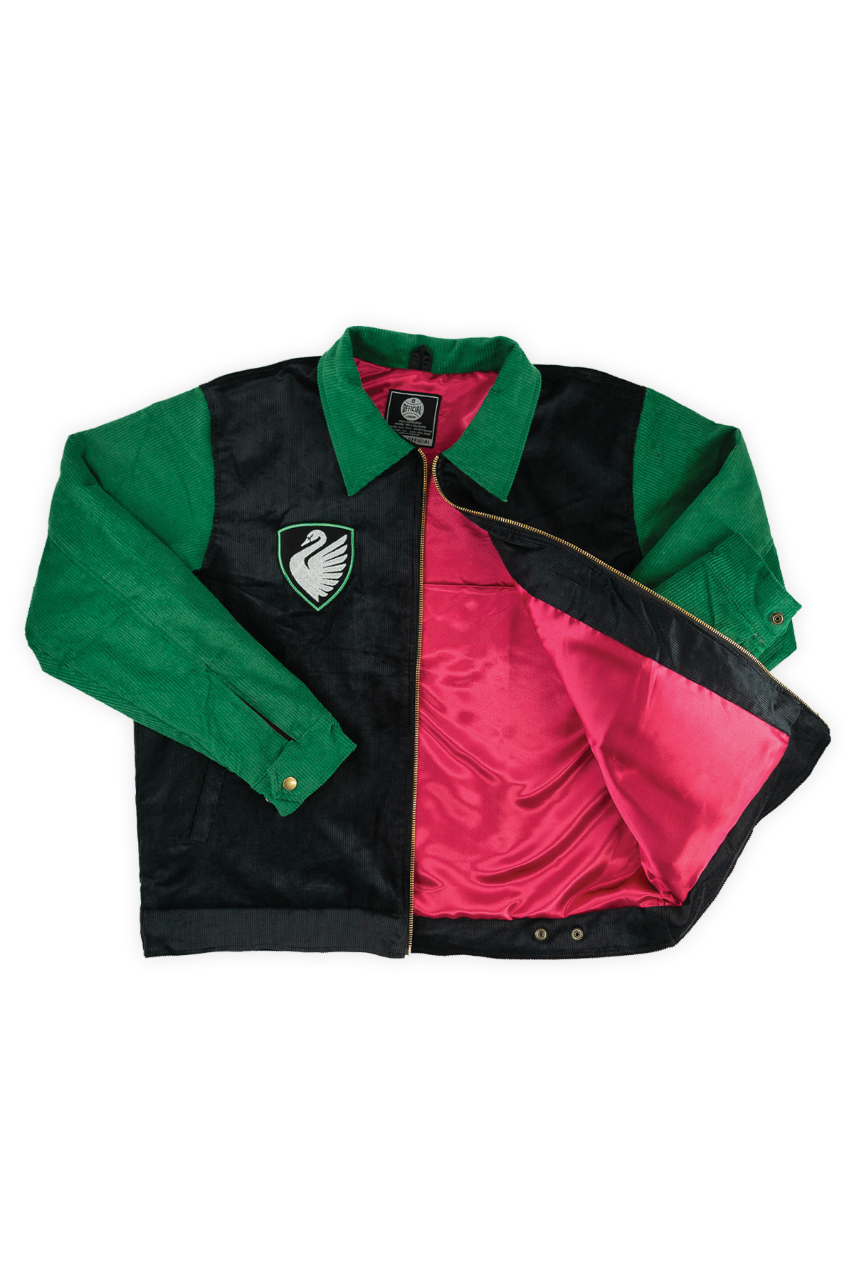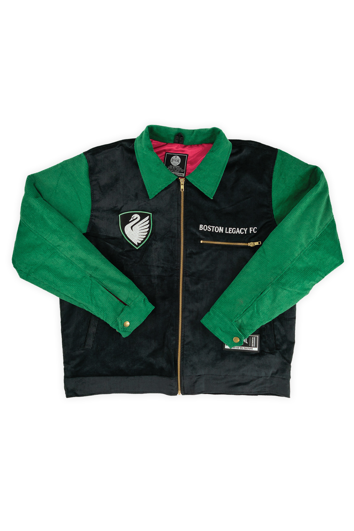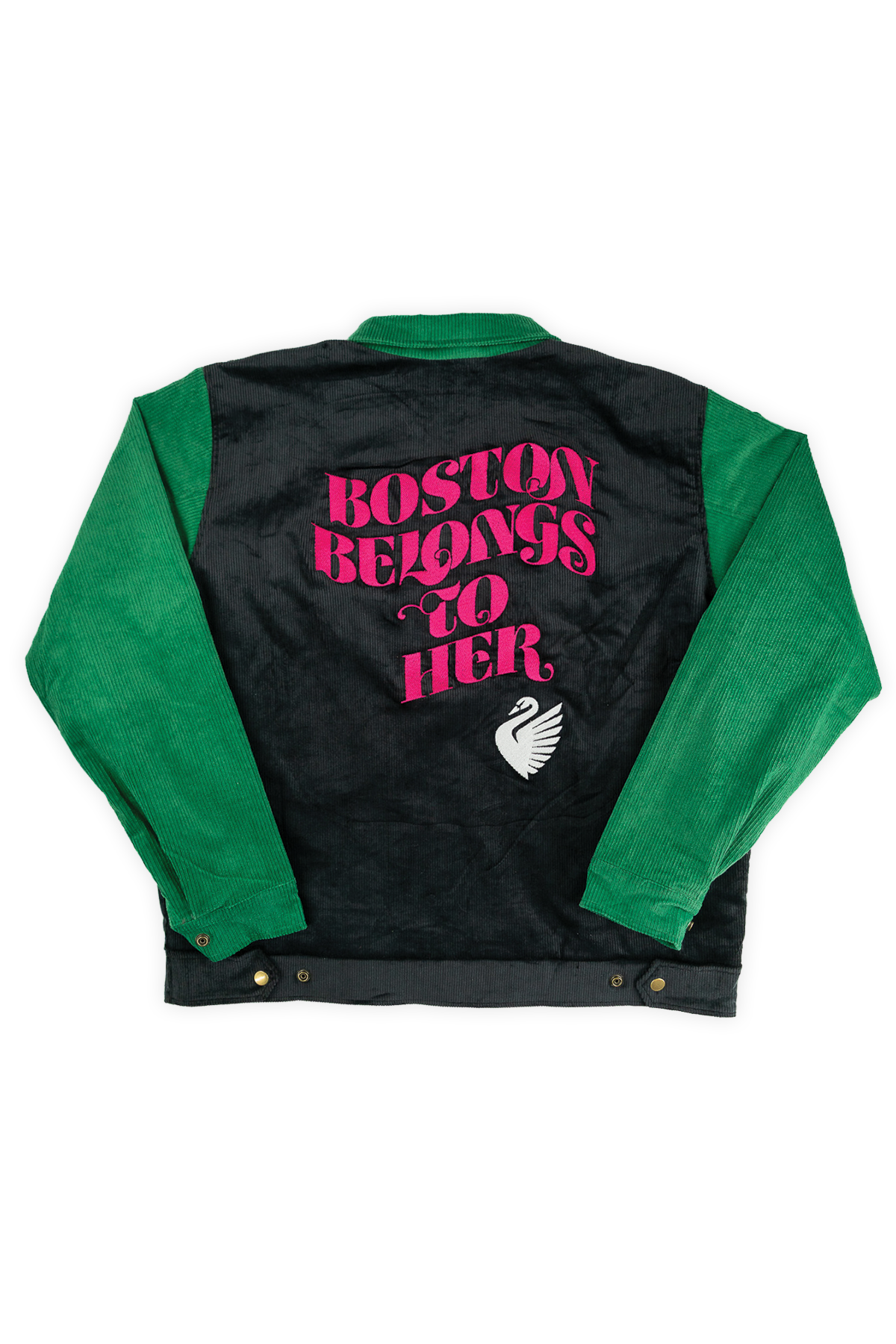 The Boston Belongs To Her Utility Cord Jacket marks the debut of a new Official League style created in collaboration with Boston Legacy FC. Inspired by the structure of the Cord Jacket and the ease of the Skater Jacket, it combines workwear utility with modern refinement. The 100% premium corduroy exterior features contrasting green sleeves, a black body, and bold pink lettering across the back that reads “Boston Belongs To Her” boldly above the Legacy's signature swan. Inside, a vibrant satin lining adds a pop of color and comfort. Finished with metal hardware, front pockets, and a full zip closure, this jacket delivers confident design with premium craftsmanship.