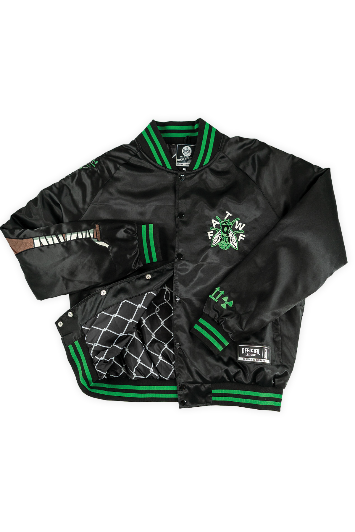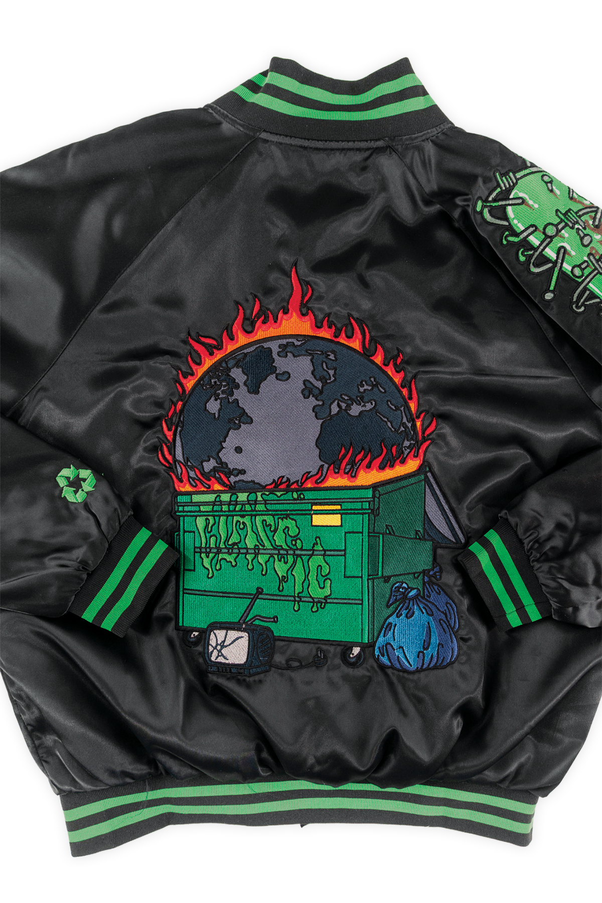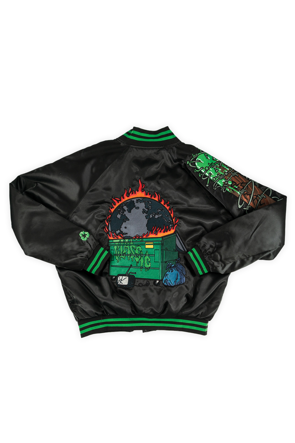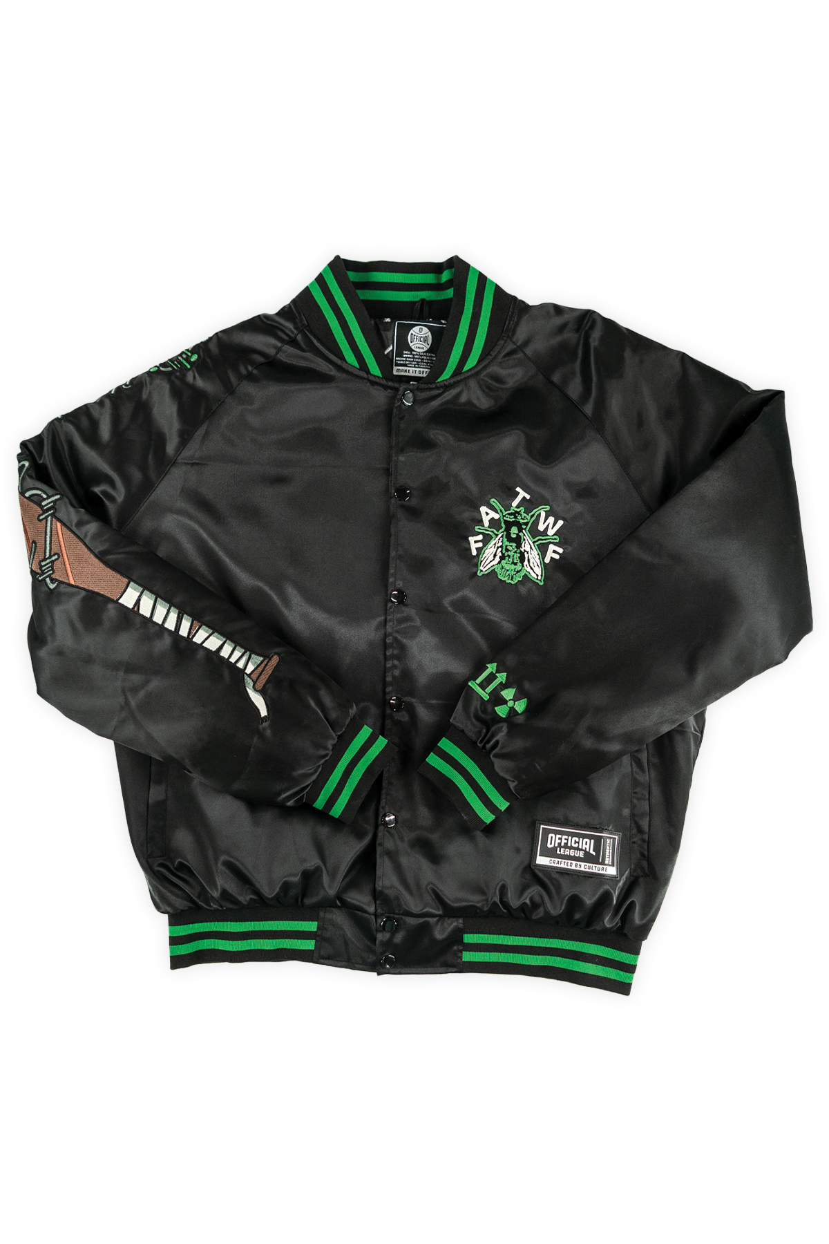 A wearable monument to the Trash Classic album. We collaborated with psych-punk heavyweights Frankie and the Witch Fingers to engineer this premium satin bomber. This slick, high-gloss tribute to the band's industrial grime aesthetic is a limited-edition statement piece. The design features the band’s signature fly insignia on the left chest and a toxic neon-green trim that cuts through the black satin base.