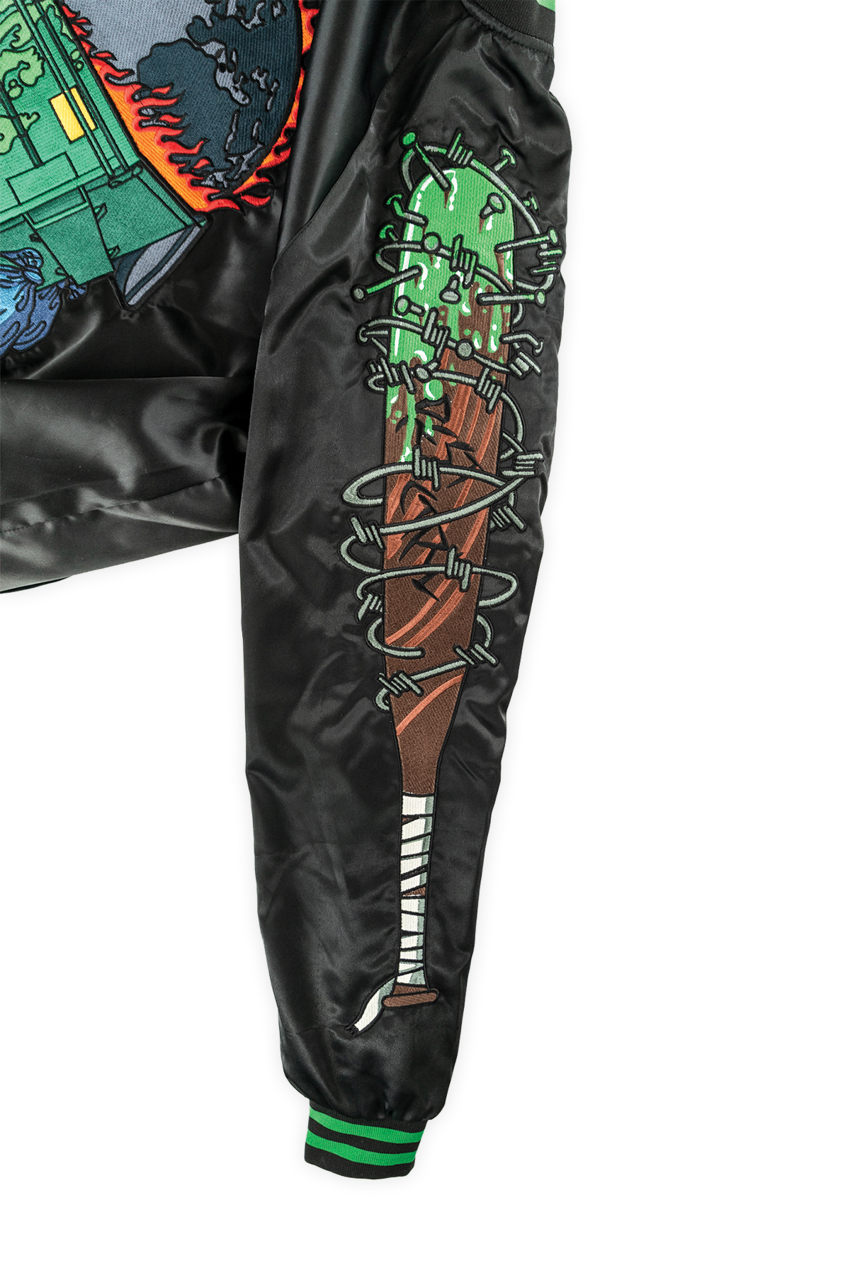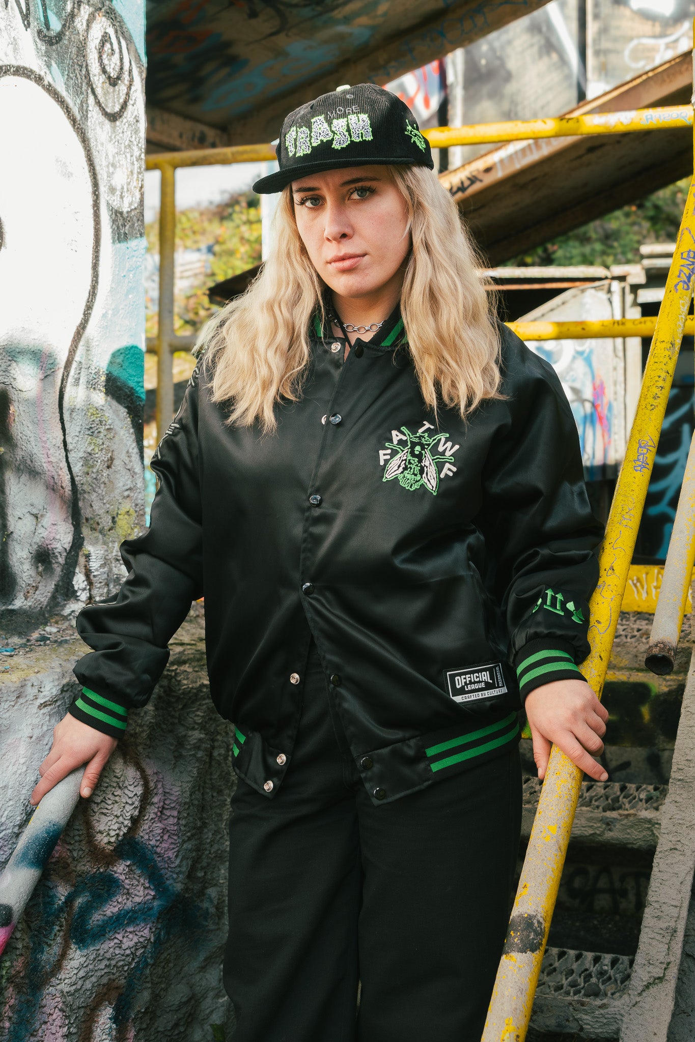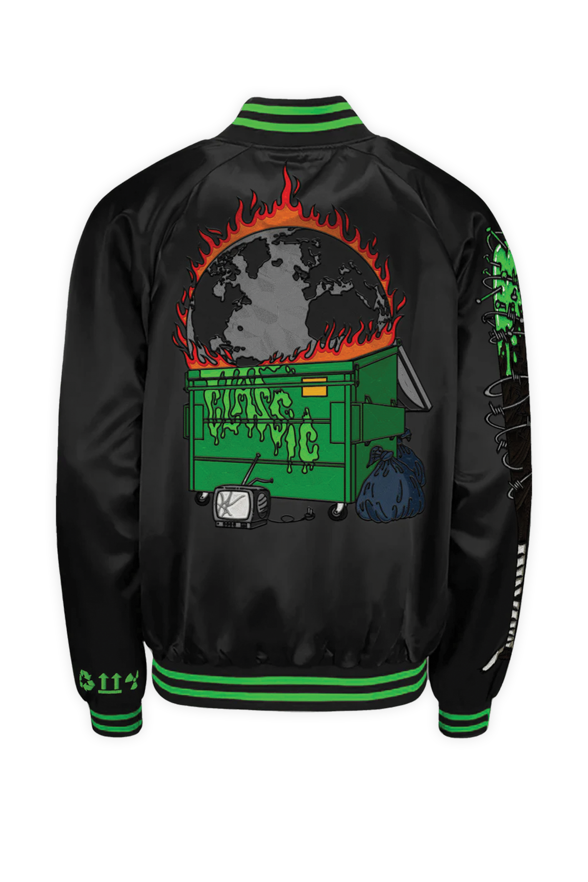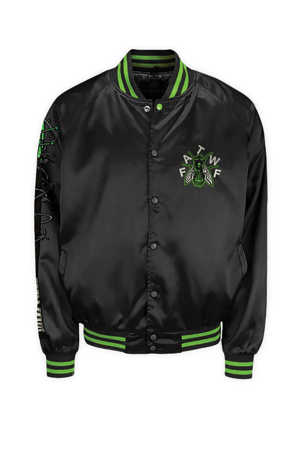A wearable monument to the Trash Classic album. We collaborated with psych-punk heavyweights Frankie and the Witch Fingers to engineer this premium satin bomber. This slick, high-gloss tribute to the band's industrial grime aesthetic is a limited-edition statement piece. The design features the band’s signature fly insignia on the left chest and a toxic neon-green trim that cuts through the black satin base.