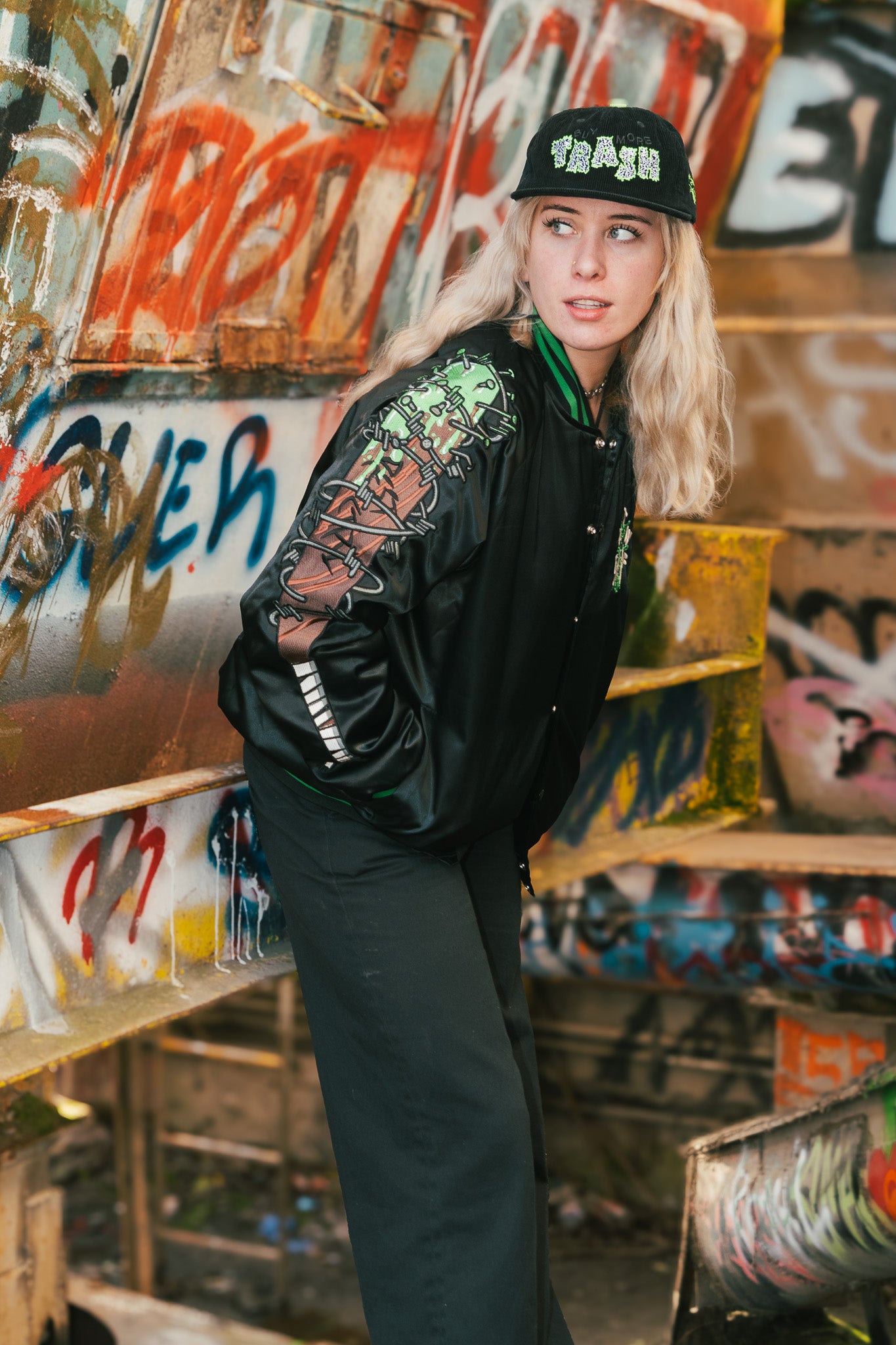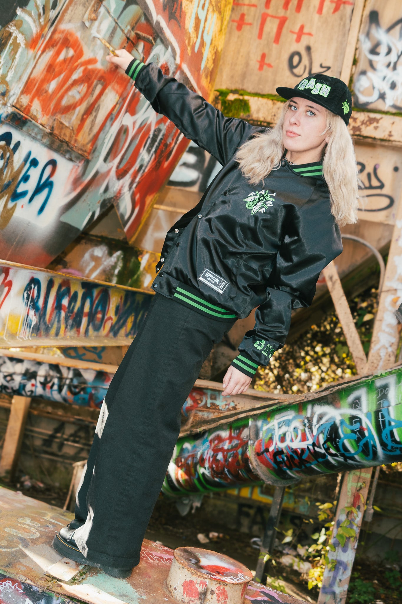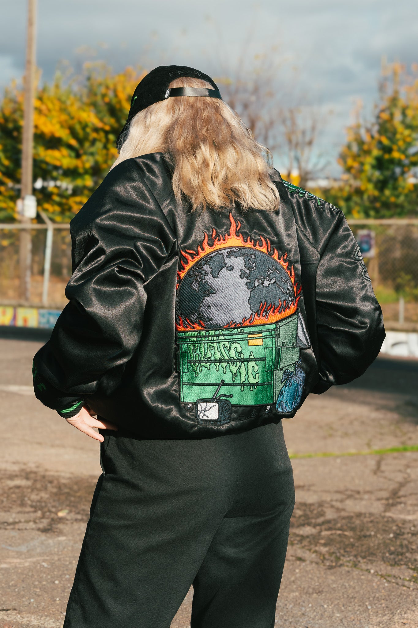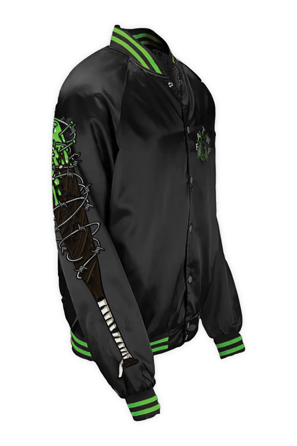 A wearable monument to the Trash Classic album. We collaborated with psych-punk heavyweights Frankie and the Witch Fingers to engineer this premium satin bomber. This slick, high-gloss tribute to the band's industrial grime aesthetic is a limited-edition statement piece. The design features the band’s signature fly insignia on the left chest and a toxic neon-green trim that cuts through the black satin base.