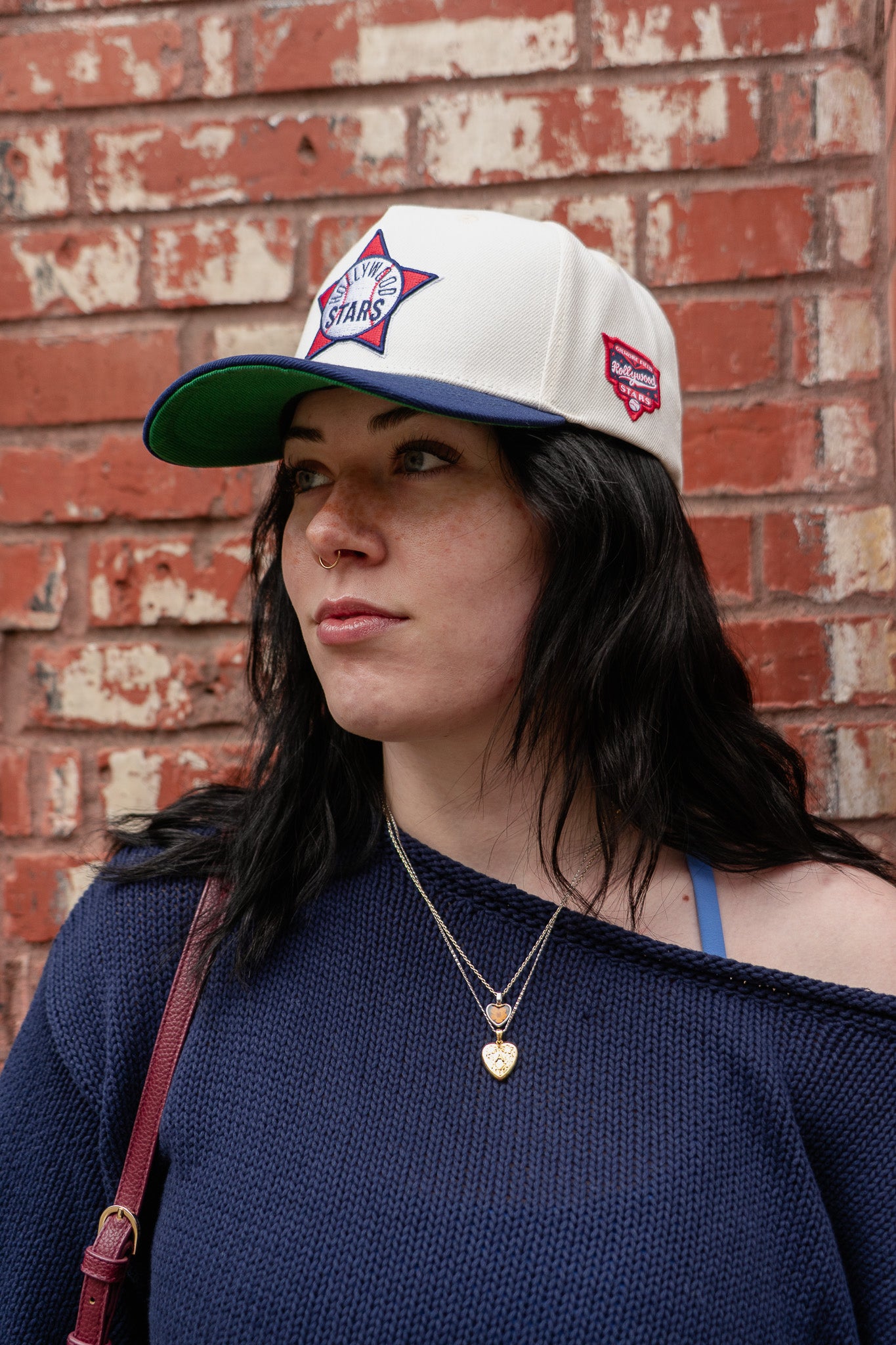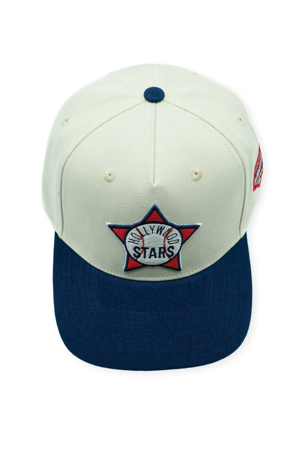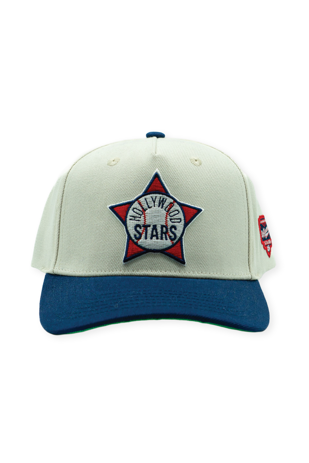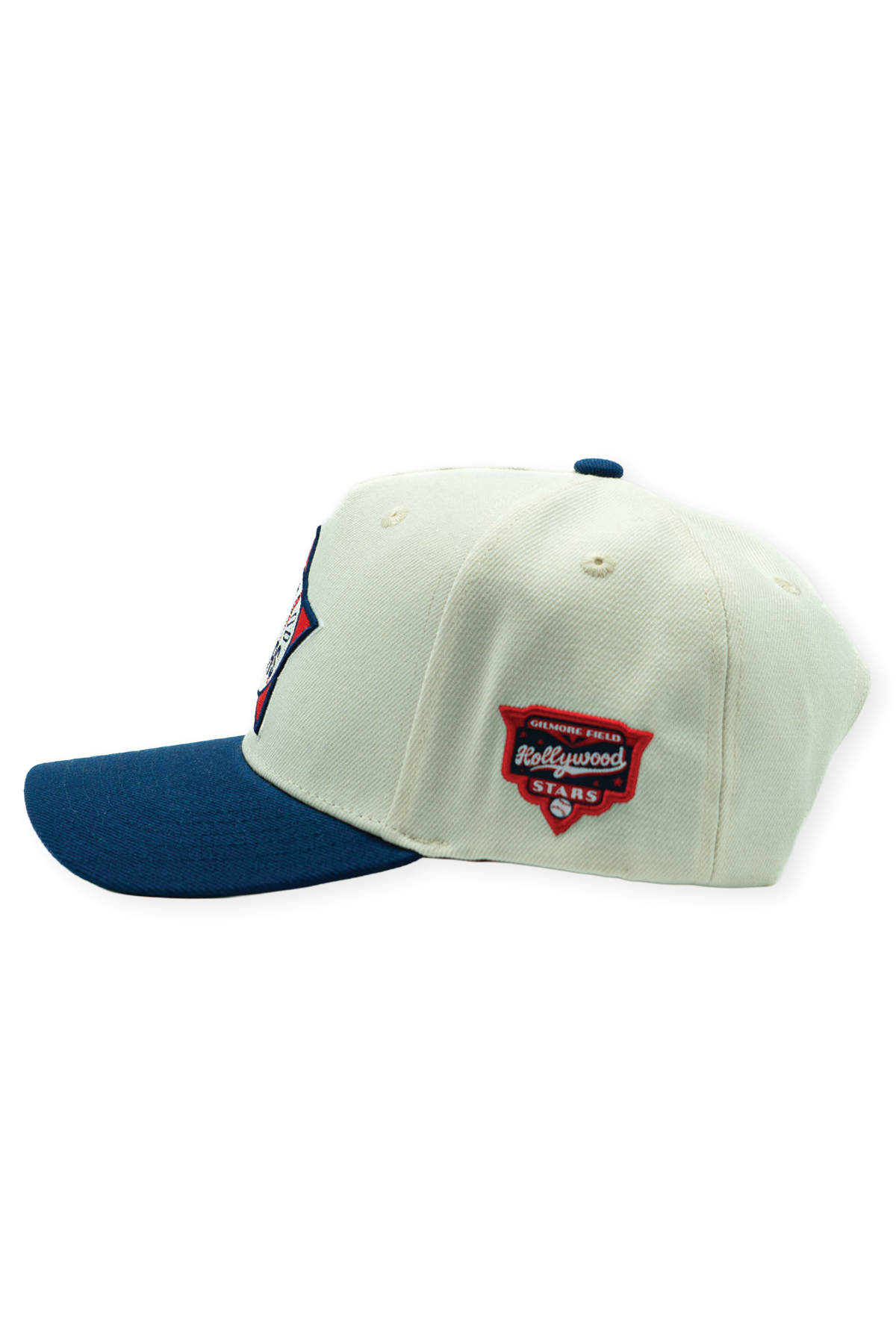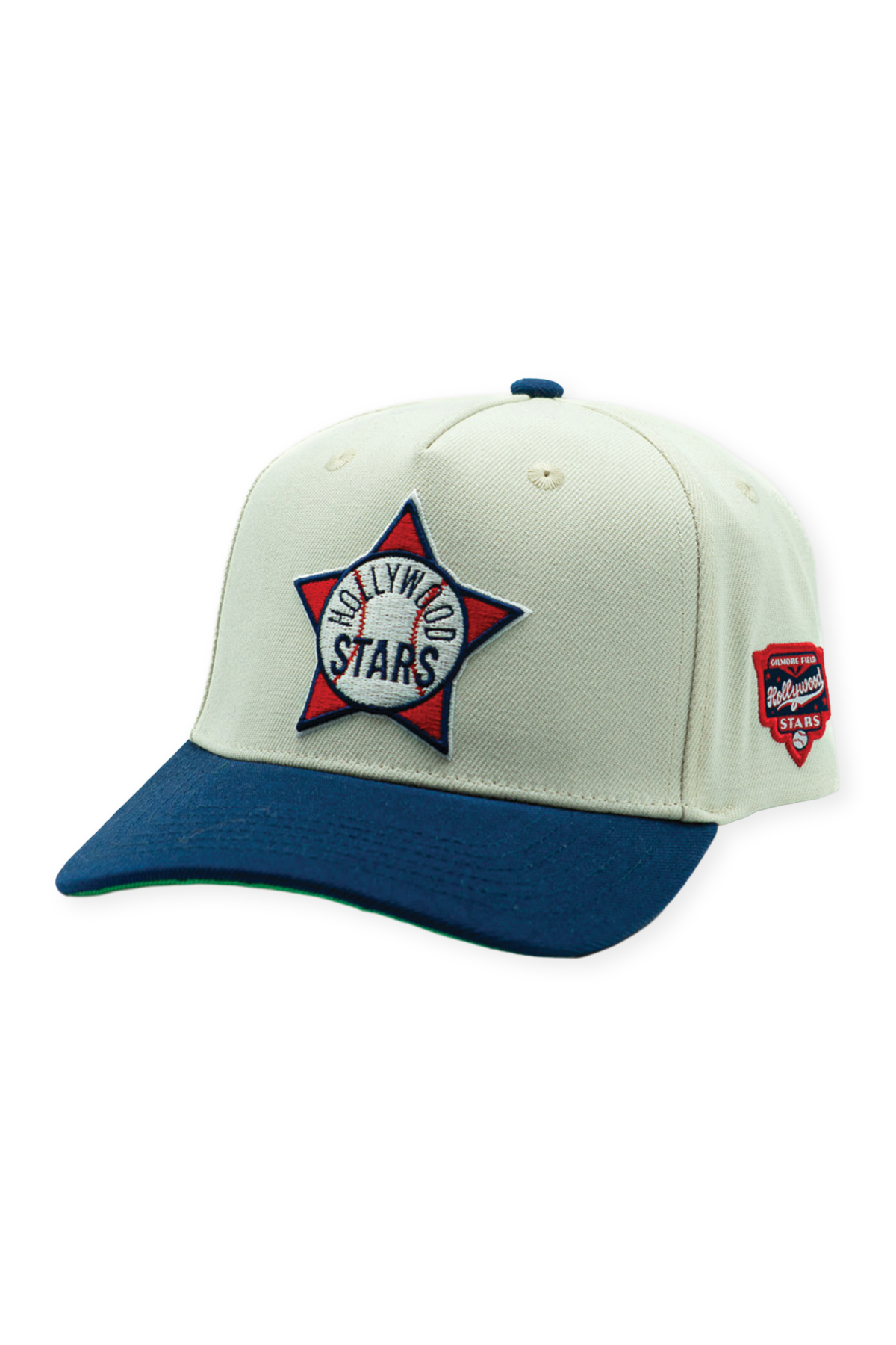 The Hollywood Stars Gilmore High Pro pays tribute to one of Los Angeles baseball’s most iconic chapters and the ballpark that helped define it. Constructed from 100% premium cotton with a structured front frame and slightly curved bill, the cap features a cream crown paired with a deep navy visor, a classic Stars color combination rooted in the club’s golden era at Gilmore Field. A classic fully green underbill adds a distinctly mid-century look. The front showcases an embroidered alternate Hollywood Stars crest in red, white, and navy, while a woven Gilmore Field side patch anchors the piece to the team’s storied home. Finished with an adjustable snapback closure, this hat carries forward the legacy of Los Angeles baseball before the major league spotlight arrived.