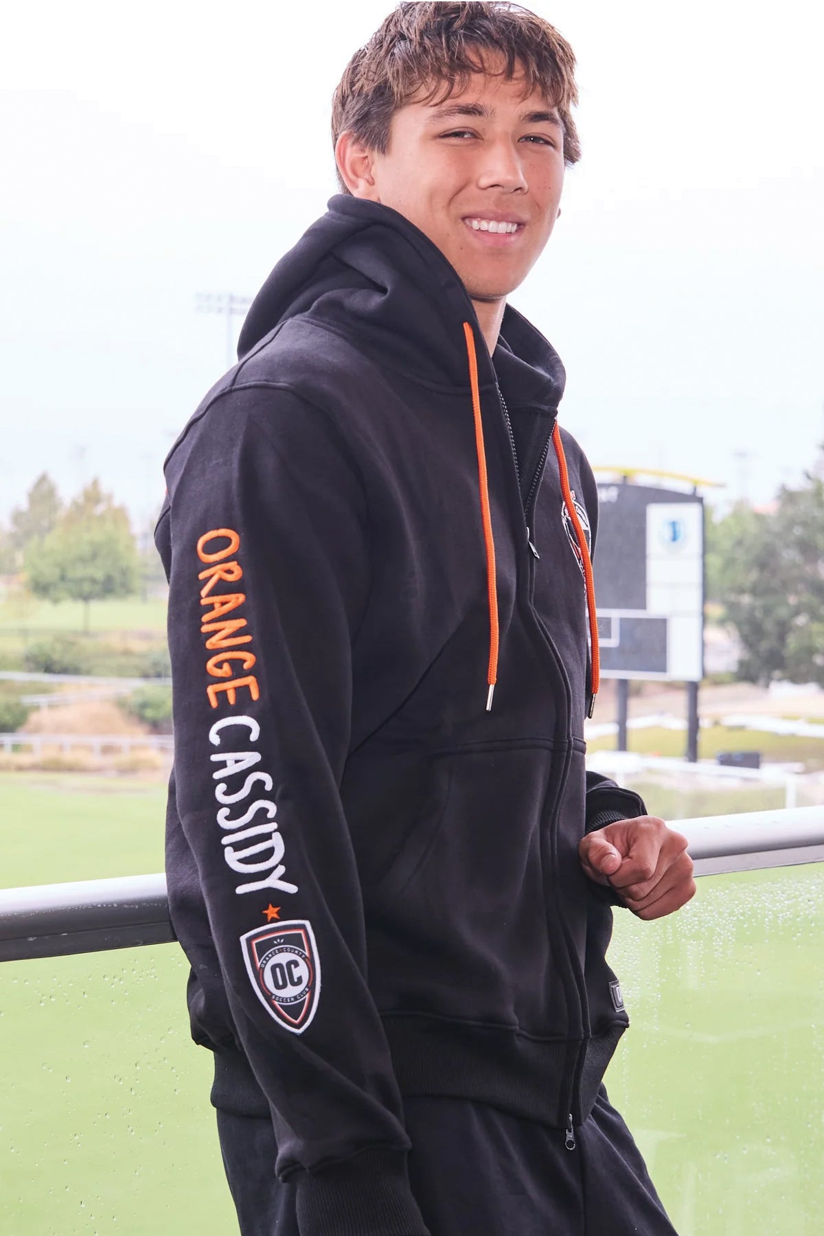 Orange meets Orange County in this limited-edition premium hoodie. Crafted for the Orange Cassidy x Orange County SC Collection, the front chest and sleeve are stitched with custom Orange Cassidy collaboration illustrations. "Orange Cassidy" is written down the right sleeve and stamped with Orange County SC's crest. Across the back, “Orange County Soccer Club” appears in Cassidy’s own handwritten lettering, topped with the USL Championship star. Built with a striking orange drawstrings and reinforced seams, this hoodie is built to last wherever.
