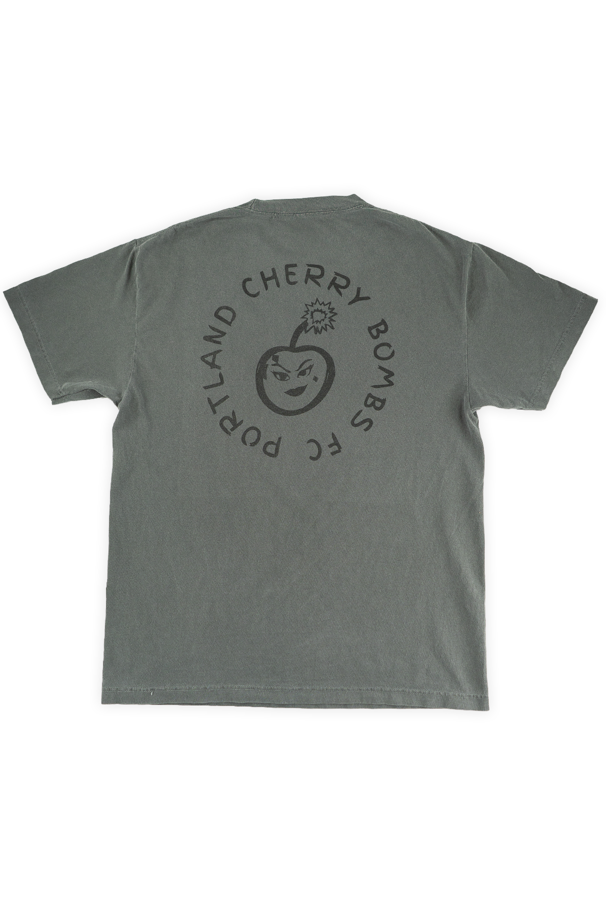Channeling the fearless spirit of the Cherry Bombs, the Cannonball Tee is crafted from 100% premium cotton, with a sleek charcoal finish. The front features a minimalist Cherry Bomb logo at the chest, while the back features an oversized “Portland Cherry Bombs FC” graphic in faded black surrounding the team’s cherry emblem.