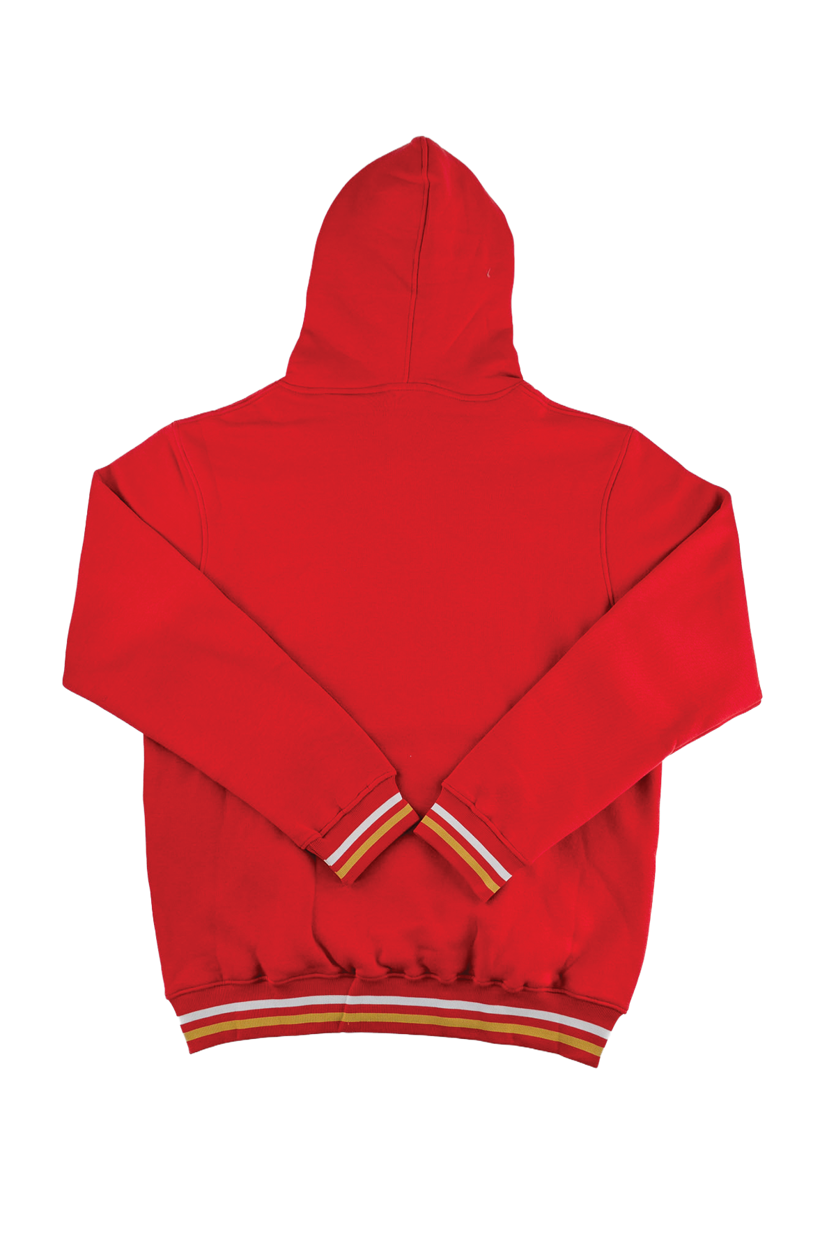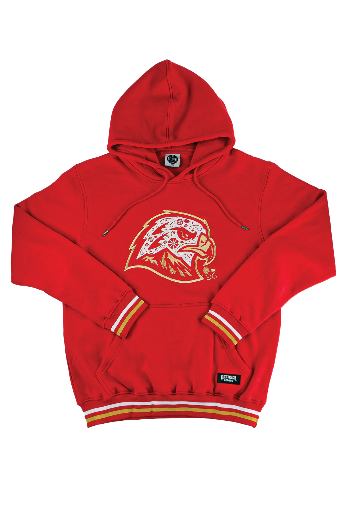 At the heart of this premium Lunar New Year hoodie is a custom Winterhawks logo, intricately layered with traditional floral patterns and swirling linework in lucky red and gold. The colors, chosen to invite prosperity and strength into the new year, are displayed across the base with matching striped cuffs and waist. This limited-edition hoodie is crafted for the Portland Winterhawks x Official League 2026 Lunar New Year collection.