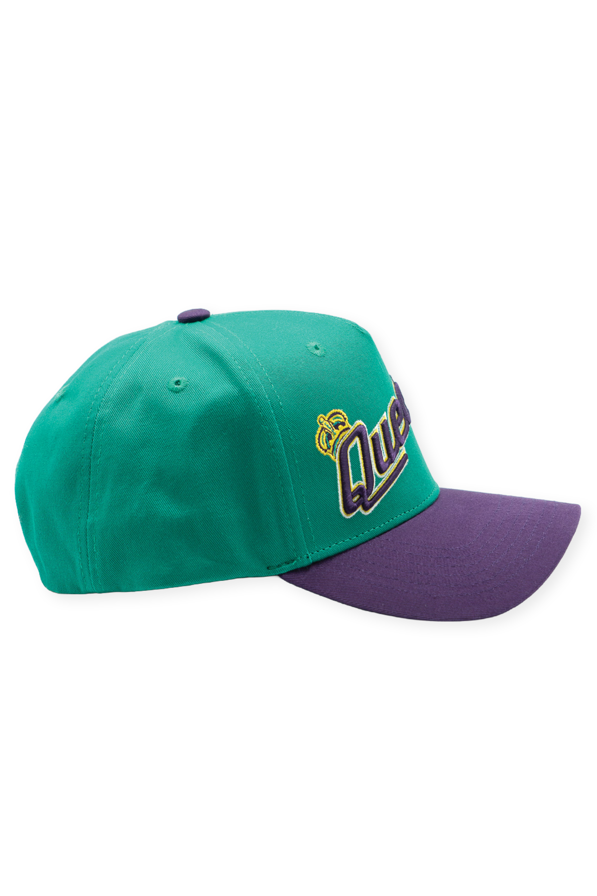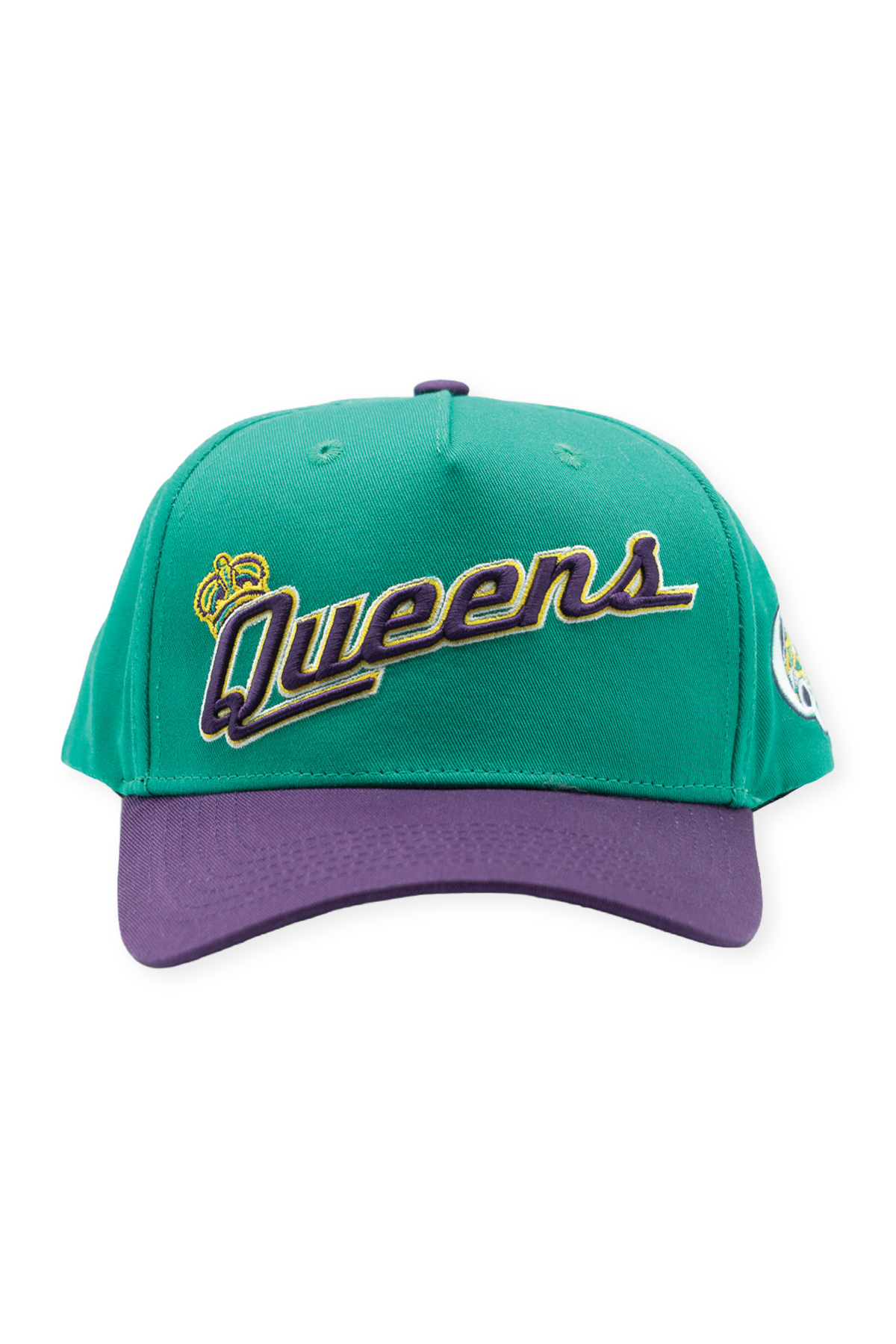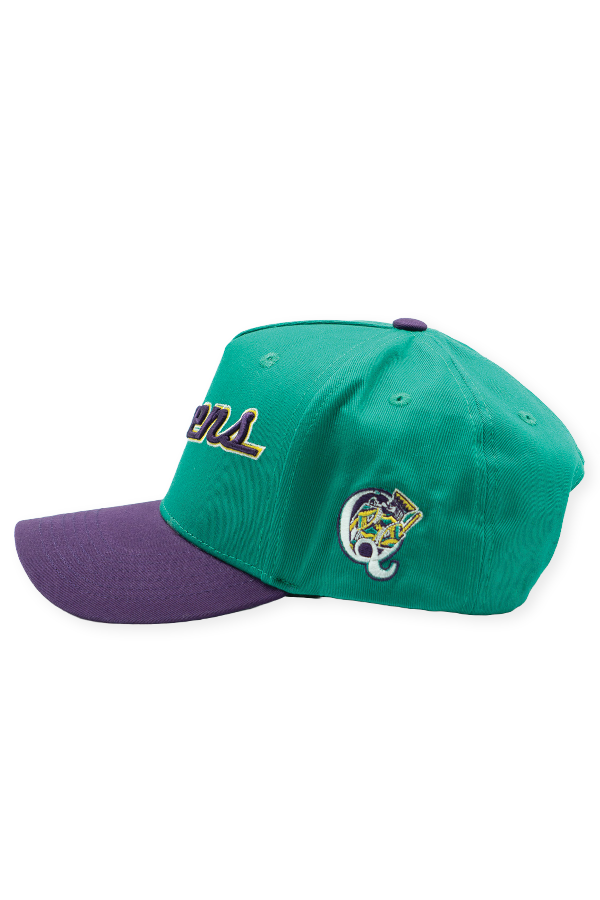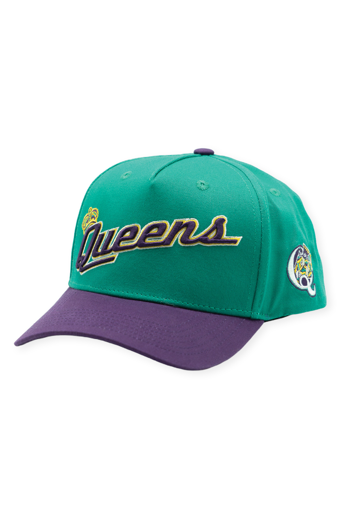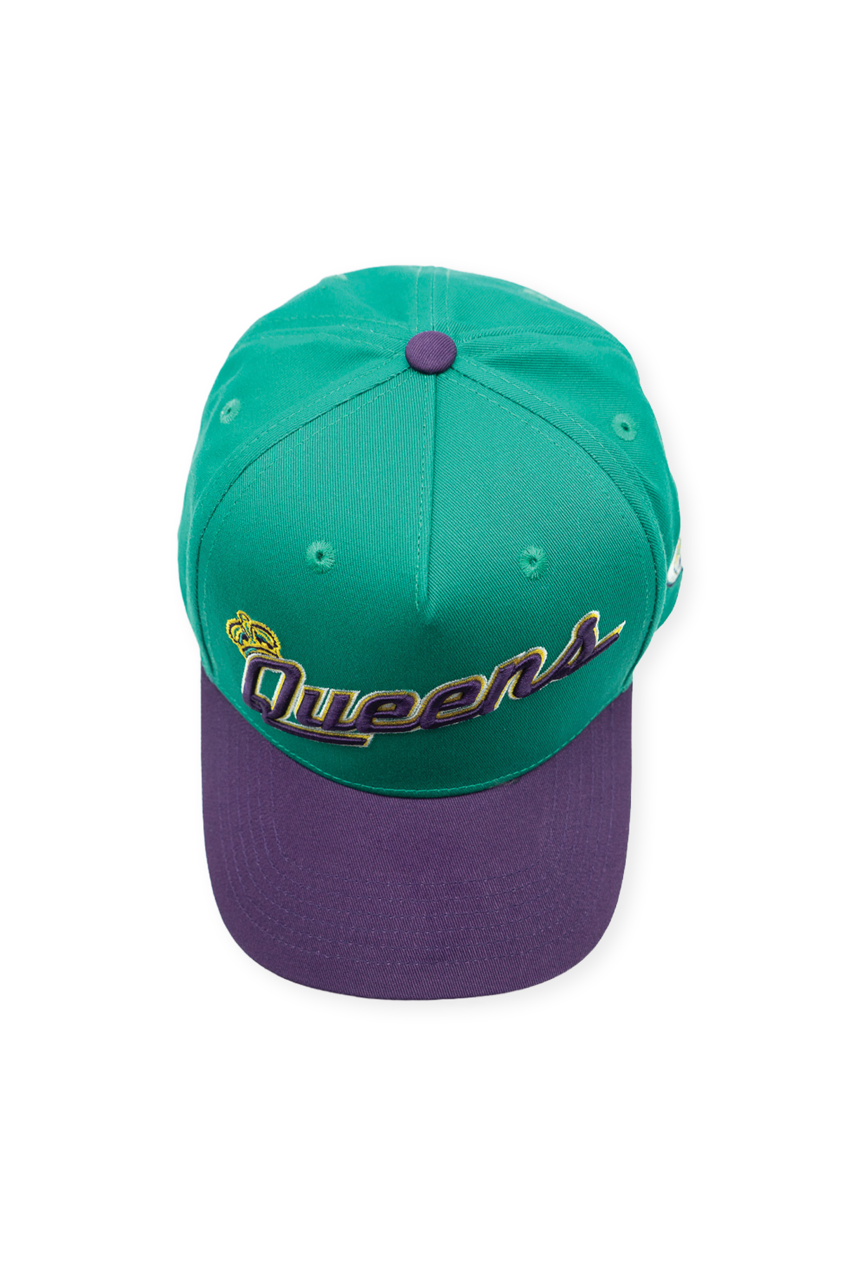This Queens Kings High Pro pays tribute to a brief but unforgettable chapter in New York baseball history. Built from 100% cotton with a structured high-profile crown and slightly curved bill, the hat pairs a vibrant teal crown with a rich purple visor, reflecting the bold, expressive identities that began to reshape minor league branding at the turn of the millennium. The embroidered “Queens” script wordmark rises across the front, subtly outlined in gold and finished with the Kings' crown. A stitched batting King on the left side and matching purple snapback closure complete the design, capturing the energy of a team whose look was ahead of its time.