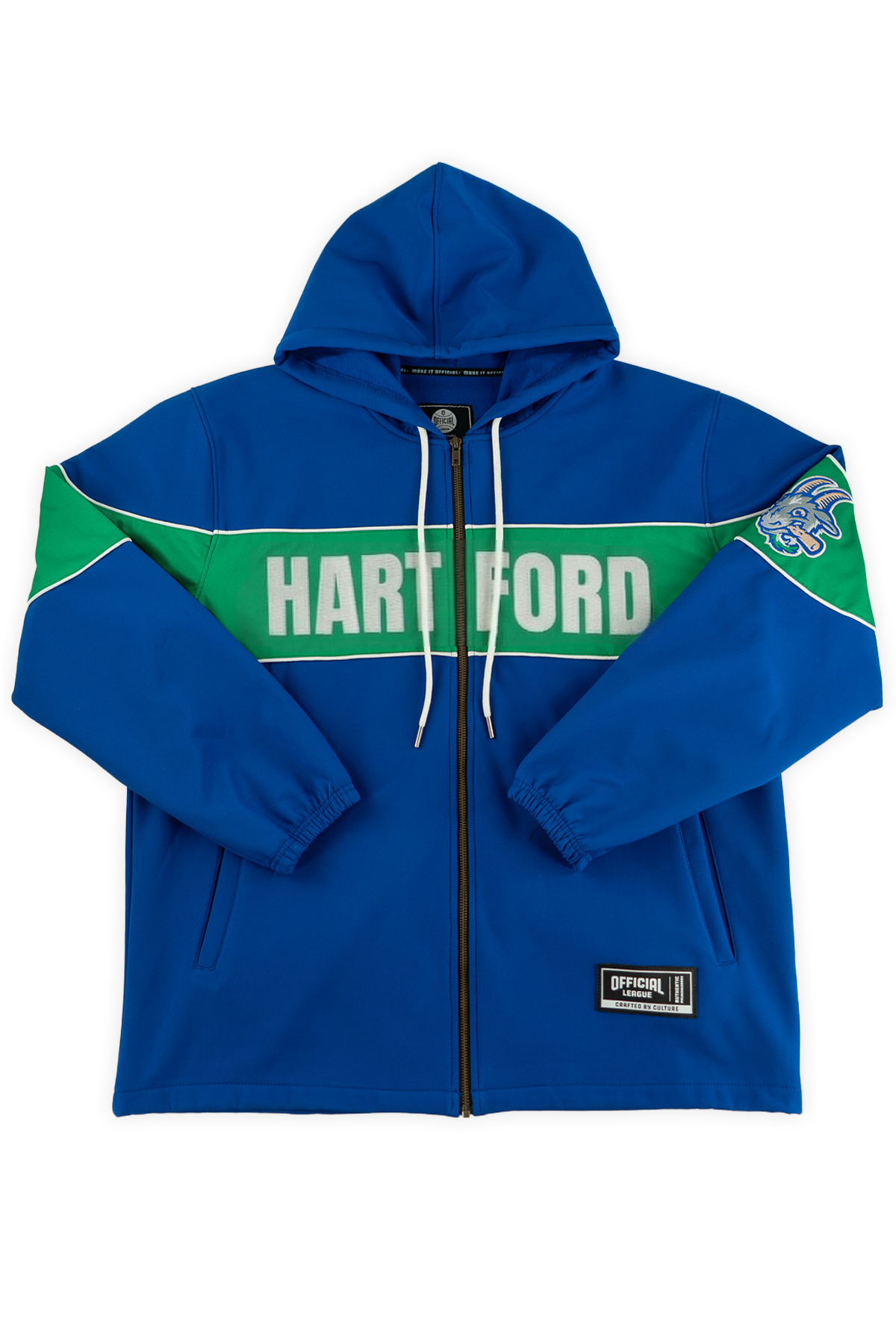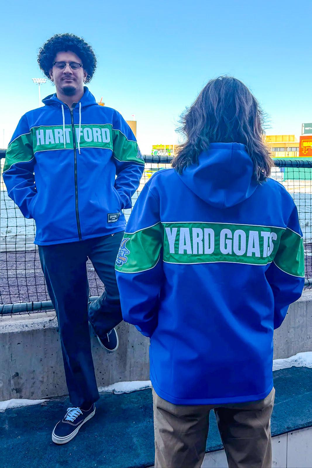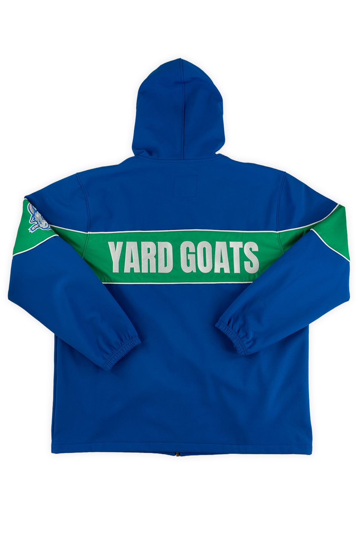 Gear up for chilly nights at Dunkin' Park with the Hartford Yard Goats Fleece-Lined Winter Coach Jacket by Official League. Combining classic athletic style with cold-weather comfort, this jacket features a smooth royal blue shell, a warm fleece interior, and a bold kelly green chest stripe displaying "HARTFORD" on the front and "YARD GOATS" on the back. Complete with the iconic bat-chewing Goat logo on the left sleeve, it's the ultimate outerwear to block out the chill whether you're on the field, in the stands, or on the streets.