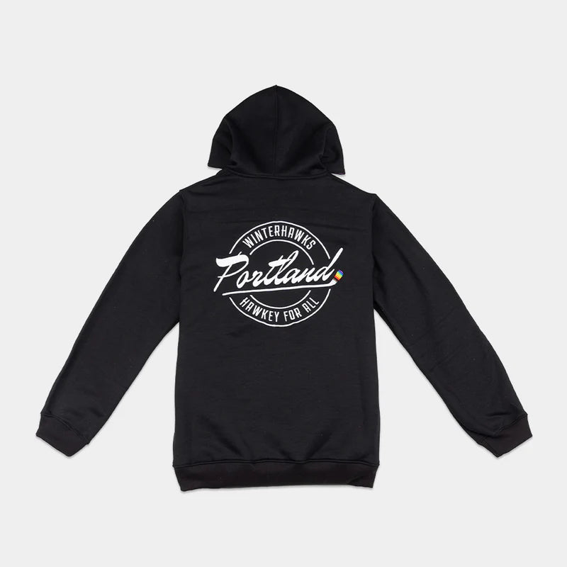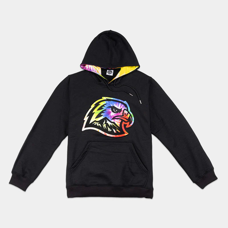 A special collaboration with the Portland Winterhawks, this exclusive hoodie features a striking design with bold, Pride tie-dye colors and the Winterhawks primary logo. Stay cozy in its soft, high-quality cotton, while the tie-dye interior hood adds a unique and vibrant twist. This hoodie was made as part of our 2025 Pride Collection with the Portland Winterhawks.
