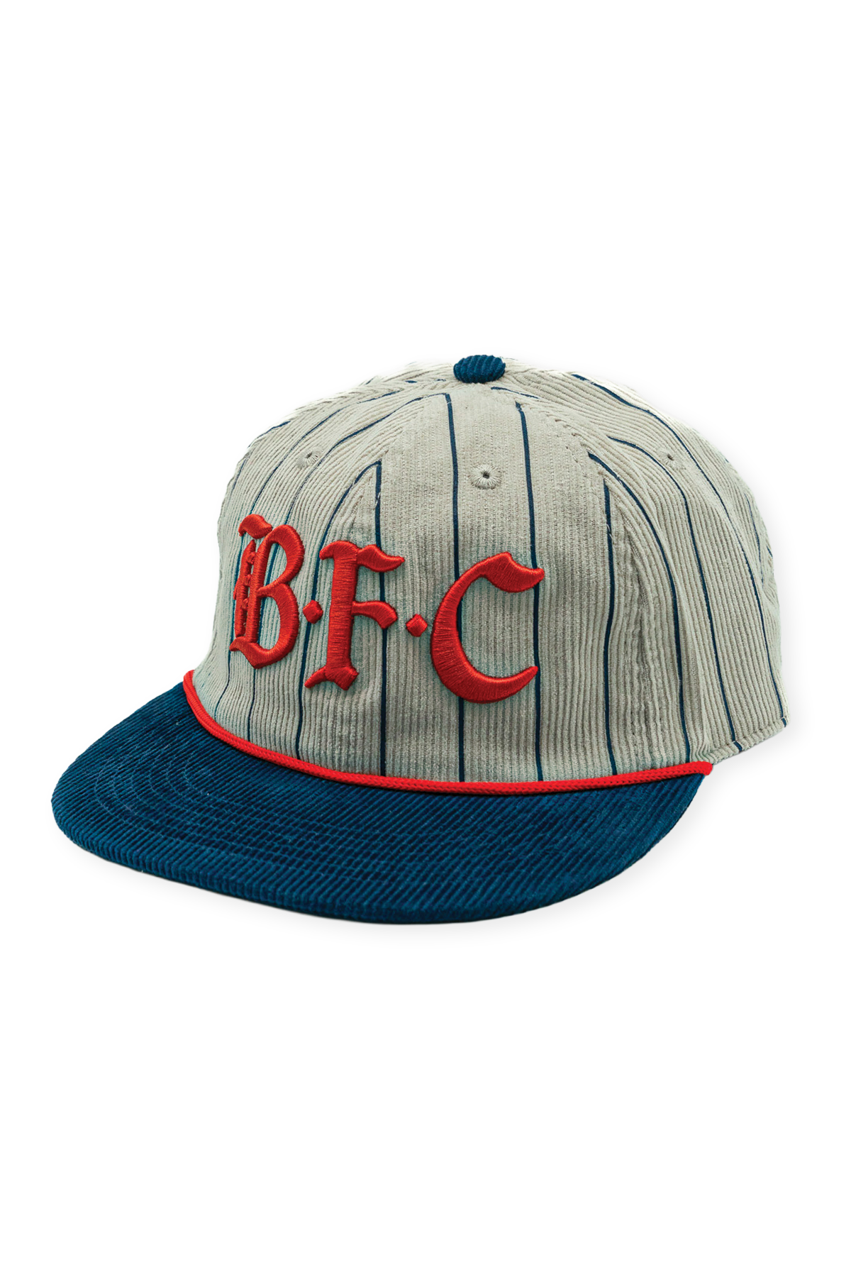 A fresh classic for the Bay, the Pinstripe Cord merges vintage baseball aesthetics with modern football culture. The crown is built from premium grey corduroy featuring subtle vertical pinstripes, anchored by a solid navy blue brim. The red "BFC" monogram pops against the rich corduroy, offering a sophisticated look for a new era. Includes an adjustable backstrap and the NWSL crest on the rear.