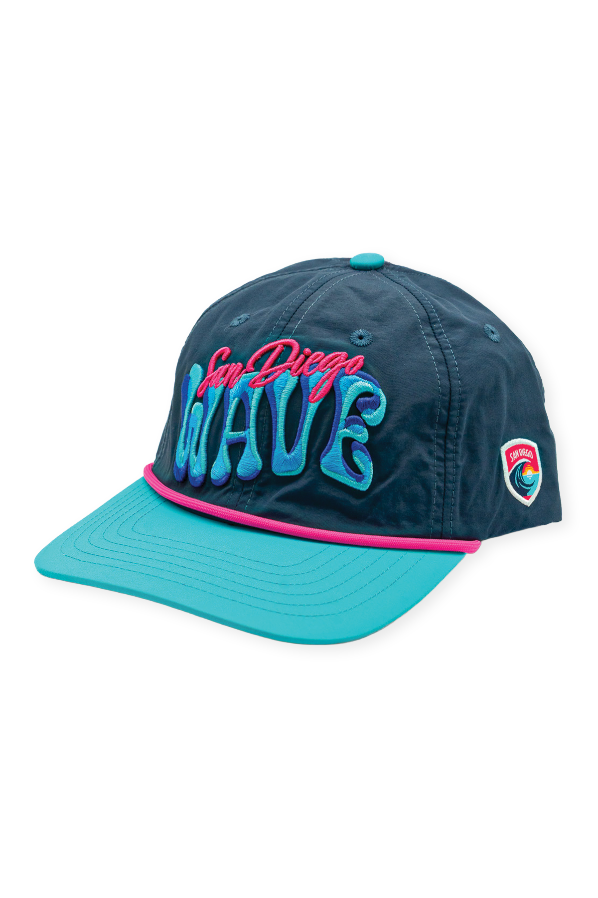 Saturated in the colors of a Pacific sunset, the Teal Tide Nylon captures the energy of the coast. This cap features a deep navy crown contrasted by a vibrant teal brim and a hot pink rope that cuts across the front like a horizon line. The puff-embroidered "Wave" script adds dimension to the lightweight, unstructured build. Finished with the NWSL crest above the adjustable backstrap, it is essential gear for days spent by the ocean or in the stands.