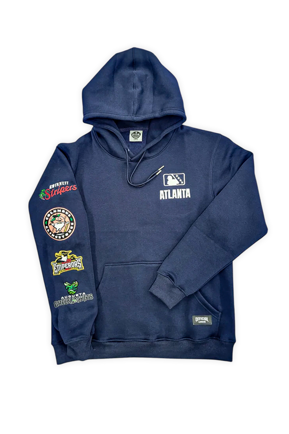This premium hoodie features the four Minor League Baseball (MiLB) affiliated teams of the Atlanta Braves organization: the Augusta GreenJackets, Rome Emperors, Mississippi Braves, and Gwinnett Stripers.