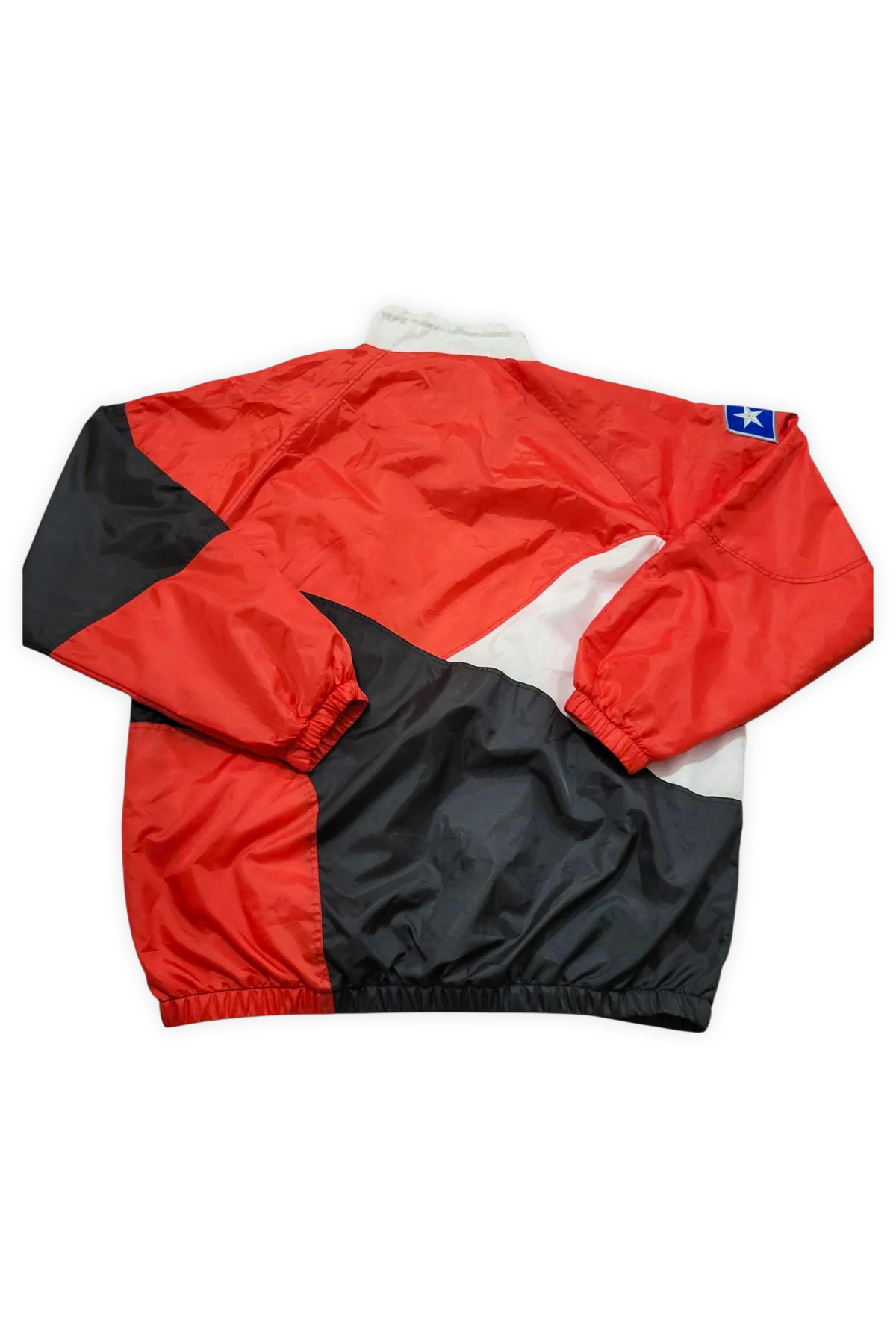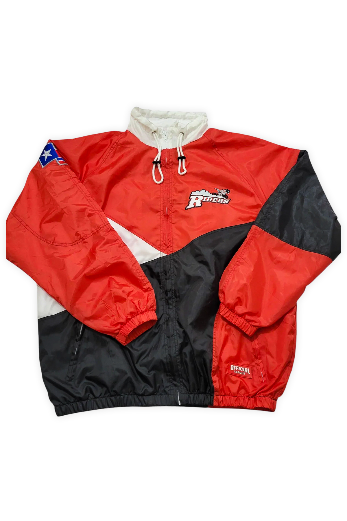 Bring vintage energy to your game-day lineup with this retro-inspired Frisco RoughRiders parachute jacket. Crafted from a lightweight, wind-resistant shell, it features bold diagonal color-blocking in striking team red, black, and crisp white. The classic "Riders" logo is embroidered over the left chest, while a stylized Texas state flag patch sits proudly on the right sleeve to represent the Lone Star State. A versatile zip-front, elasticized cuffs and hem to keep the breeze out, and a high stand-collar with adjustable drawstrings complete this weather-ready silhouette, making it an essential layer for chilly nights at the ballpark or retro street style.