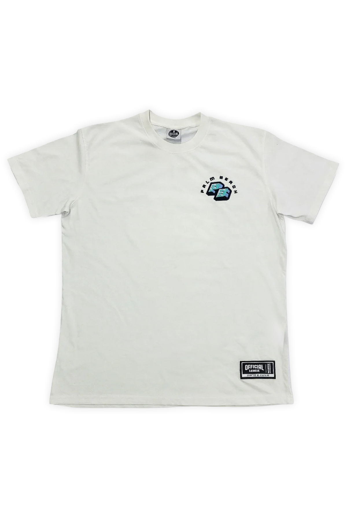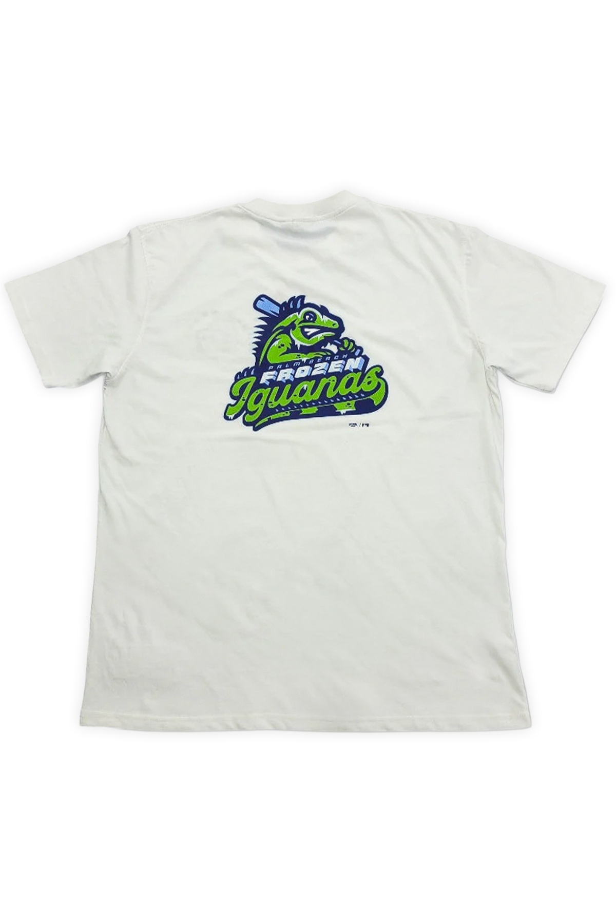 Designed to capture the quirky, irreverent spirit of South Florida's most notorious winter weather phenomenon, this premium short-sleeve tee presents a striking dual-sided look on a crisp white, high-quality fabric base. The front of the garment highlights exceptional craftsmanship with a tactile, stitched "PB" block logo in frosty blue hues, crowned by a clean "Palm Beach" arch on the left chest. The back features a bold, oversized graphic of the fierce, bat-wielding green iguana mascot braving the chill, set above a stylized, frost-draped "Frozen Iguanas" wordmark. The entire piece is anchored by the authentic Official League woven tag at the lower front hem.