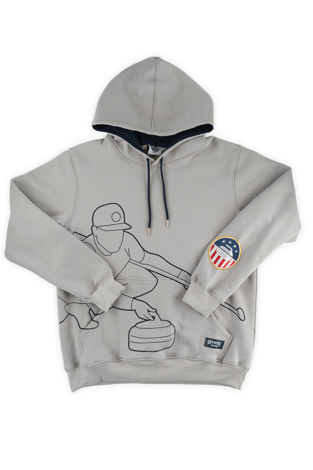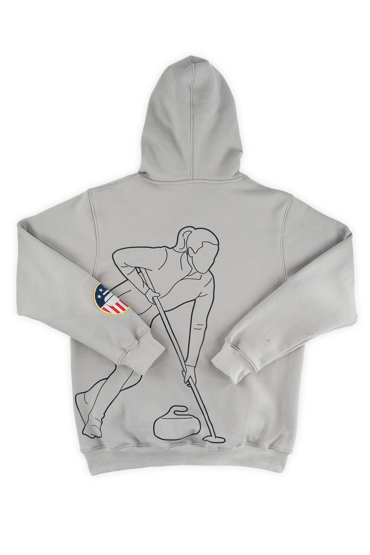 Featuring minimalist line art on both the front and back, this limited-edition silhouette series hoodie is perfect for repping your love for curling. The front showcases the thrower pushing the curling stone, while the back highlights the sweeper, celebrating all aspects of the sport. On the sleeve, a USA Curling patch adds a patriotic touch. Made with premium material, this hoodie provides a comfortable way to stand out for athletes, fans, and all Team USA fans.