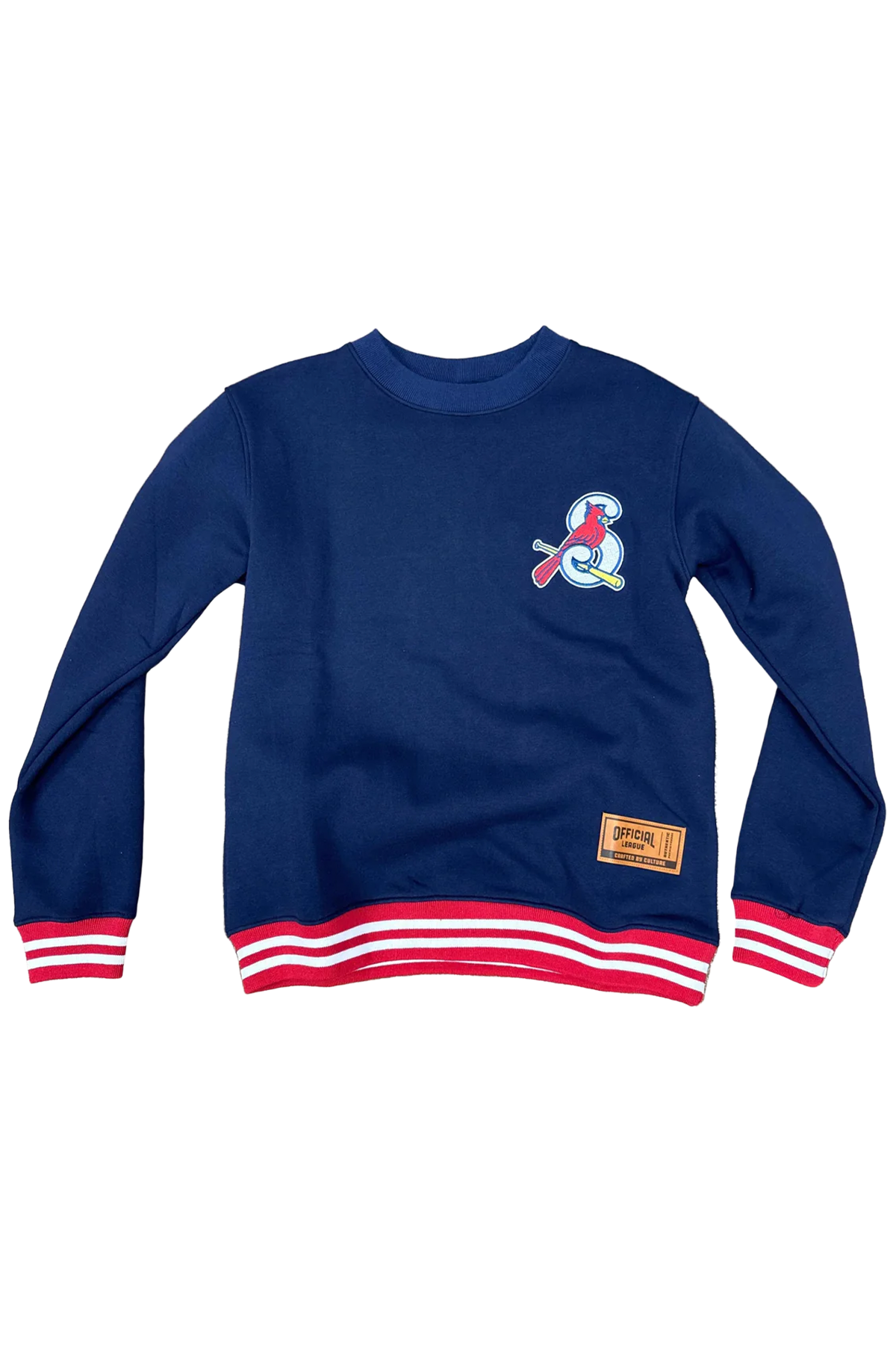 This premium Navy Springfield Crew has a classic base for the embroidered Springfield Cardinal bird patch on the left chest, celebrating a the tradition of Missouri baseball. To create a striking contrast, this retro-styled piece features a matching navy blue collar, alongside contrasting red ribbed cuffs and hem, each detailed with clean white striping. The authentic leather Official League patch is featured on the lower left hem, adding a final touch of premium craftsmanship.