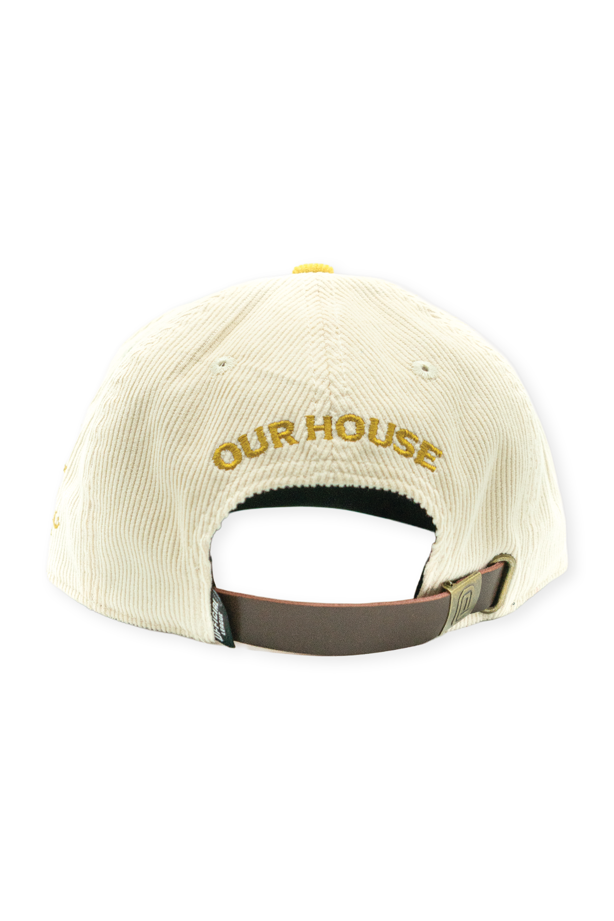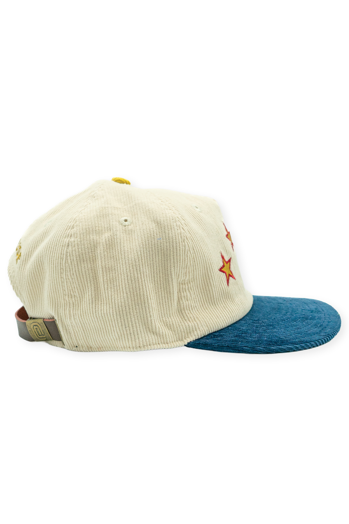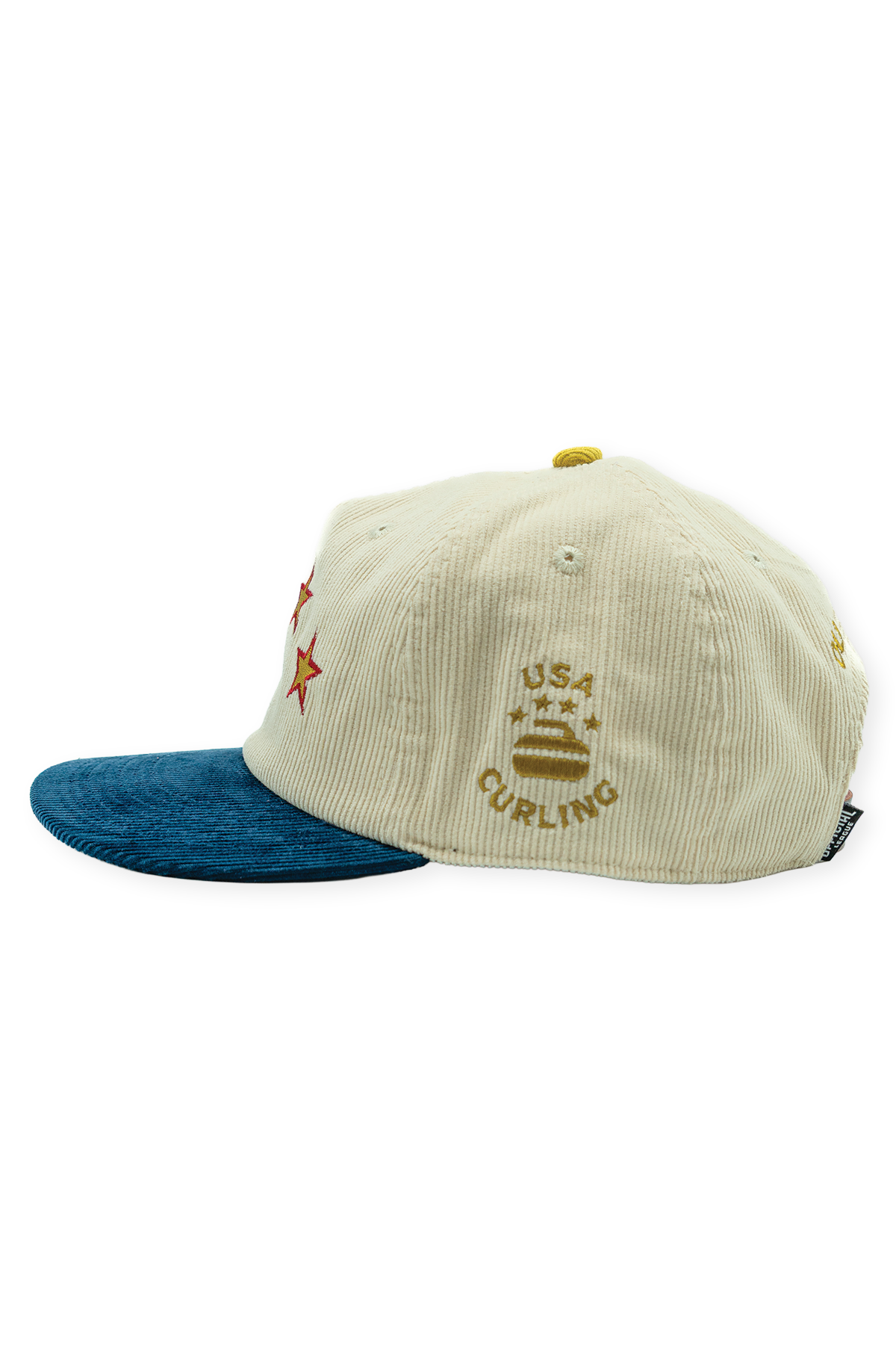 Show your pride for USA Curling with this vintage-style cord hat. The cream crown includes four embroidered red and gold stars, representing the four members of a traditional curling team. The cream is contrasted with a deep navy blue bill to show American pride. Finished with an adjustable strap for comfort, this hat is a simplistic addition to any outfit for curler fans or those who want to support the red, white, and blue.
